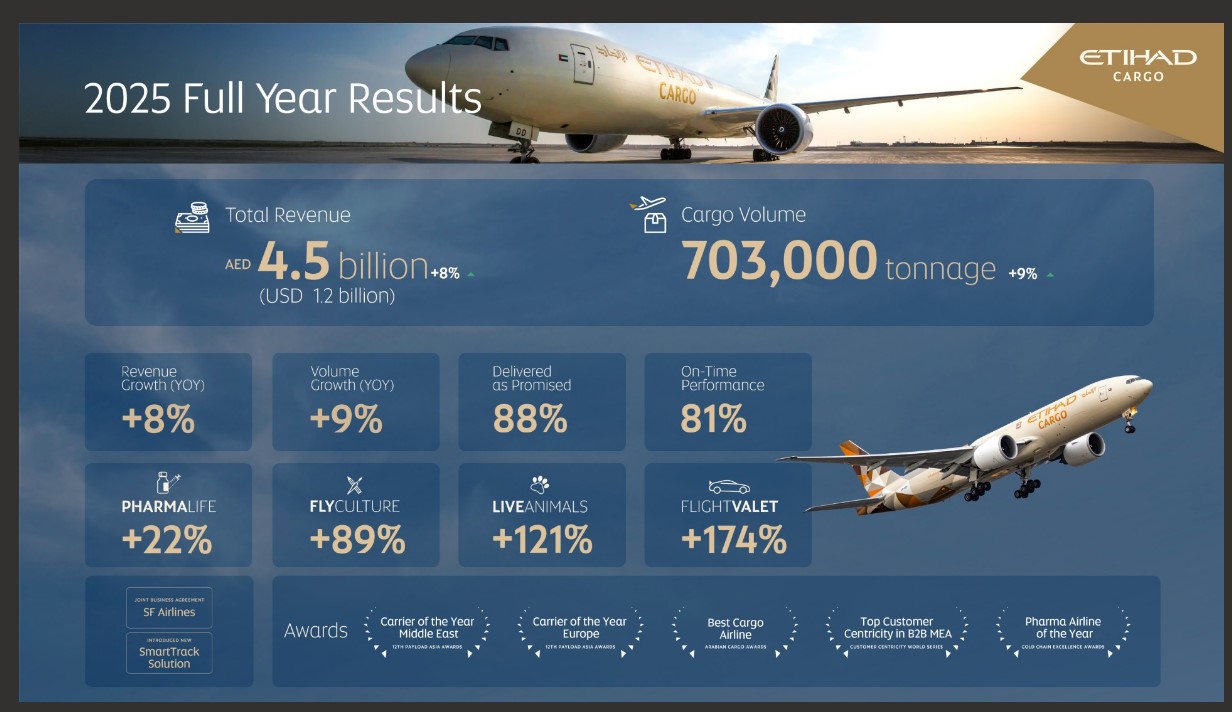 NATIONAL, INDIA  Etihad Cargo, the logistics arm of Etihad Airways, delivered strong performance in 2025, increasing revenue by 8% year-on-year while transporting 703,000 leg tonnes, marking a 9% rise in volumes. The results reflect sustained demand across key trade lanes and the continued strength of its specialised product portfolio.