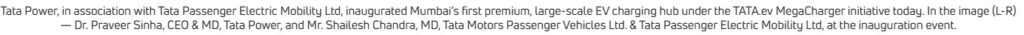 Tata Power, India’s largest vertically integrated power company and the country’s leading EV charging provider, joined hands with Tata Passenger Electric Mobility Ltd., India’s largest 4-wheeler EV manufacturer, to inaugurate Mumbai’s first premium, large-scale EV charging hub under the TATA.ev MegaCharger initiative.